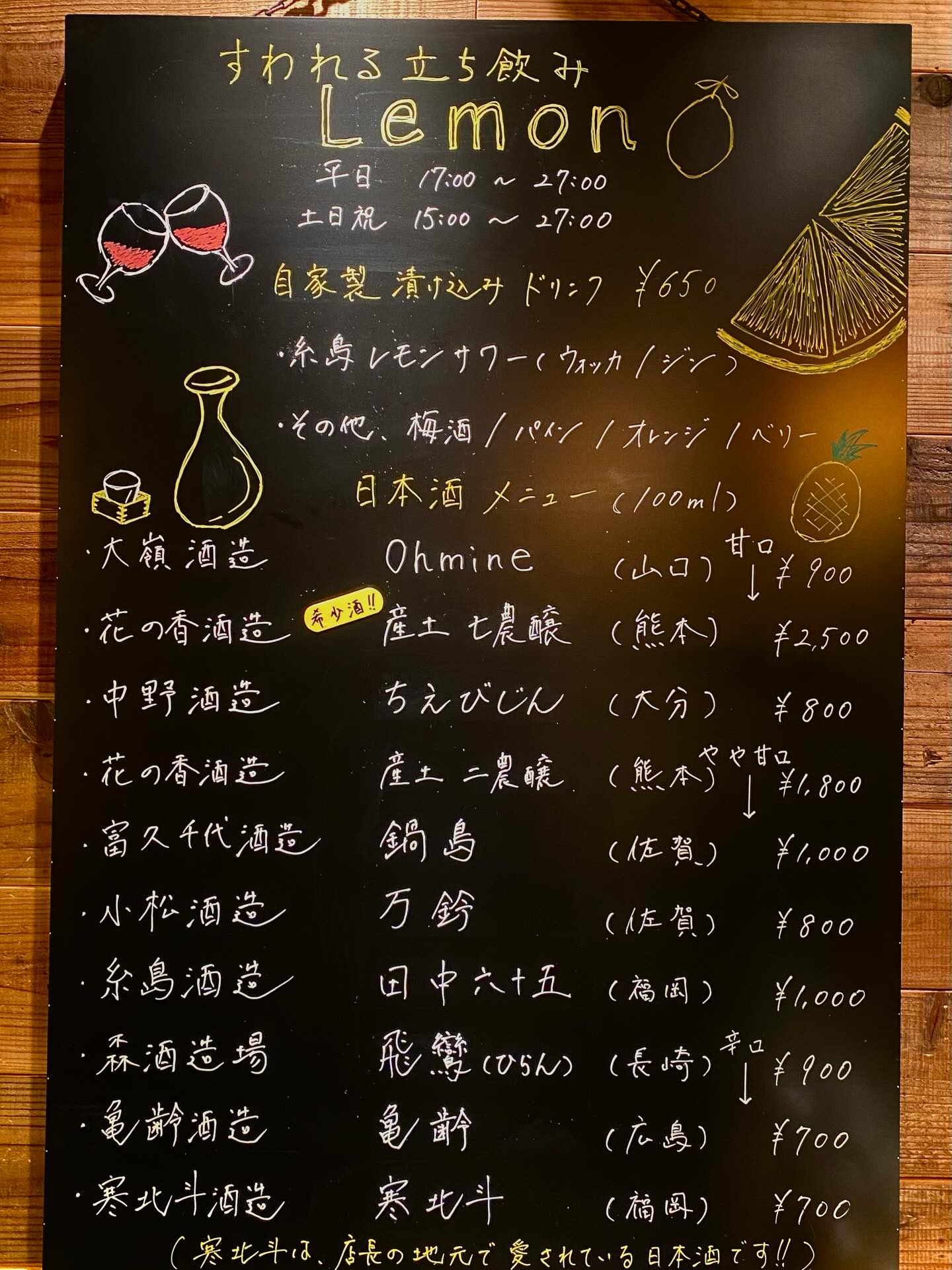 福岡市中央区の春吉エリアにある「すわれる立ち飲みレモン(春吉店)」は、
